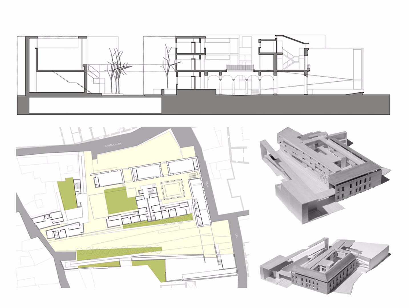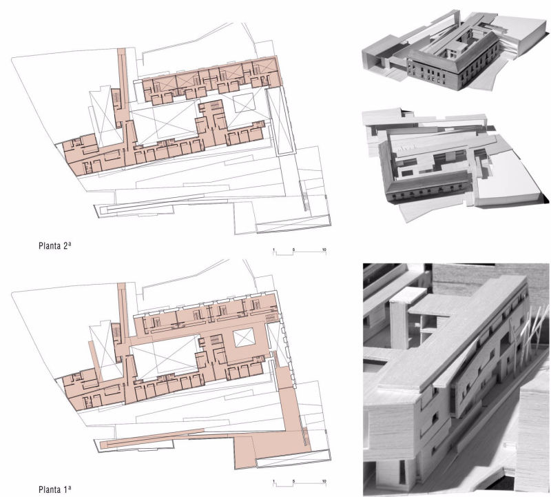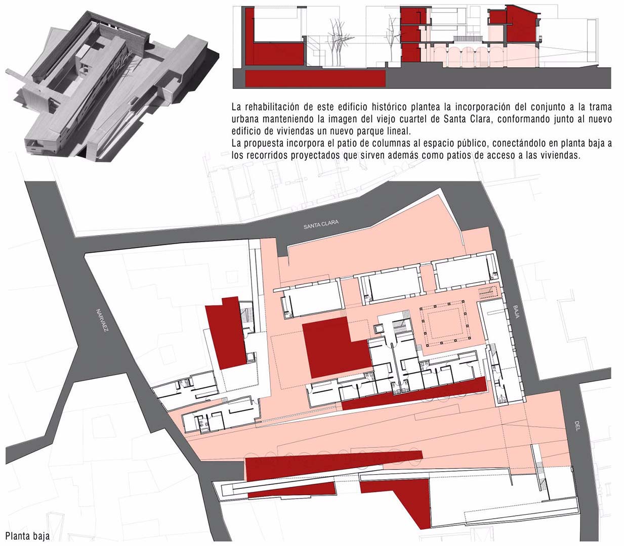 The conversion of these historic buildings intends their incorporation into the city structure while maintaining the appearance of the old Santa Clara barracks at the point where they overlook the square and Horno de Santa Clara Street, so that, together with the new block of flats, new public spaces are created, with special emphasis on spatial continuity. The inauguration of the new linear park permits Narvaez and Baja del Marquéz Streets to be connected from east to west. The limits of this new public space within the city structure are established by the terrace of south facing housing and the new north facing cultural centre. The qualities of this area allow it to be both dynamic in its course and use and also static for public leisure.