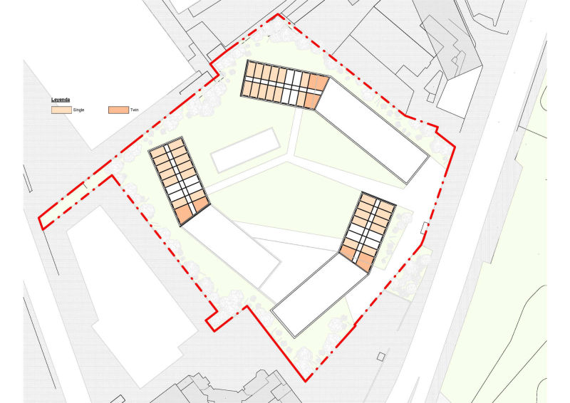 Student accommodation organised around a large central courtyard of sufficient size to generate various student exchange activities.