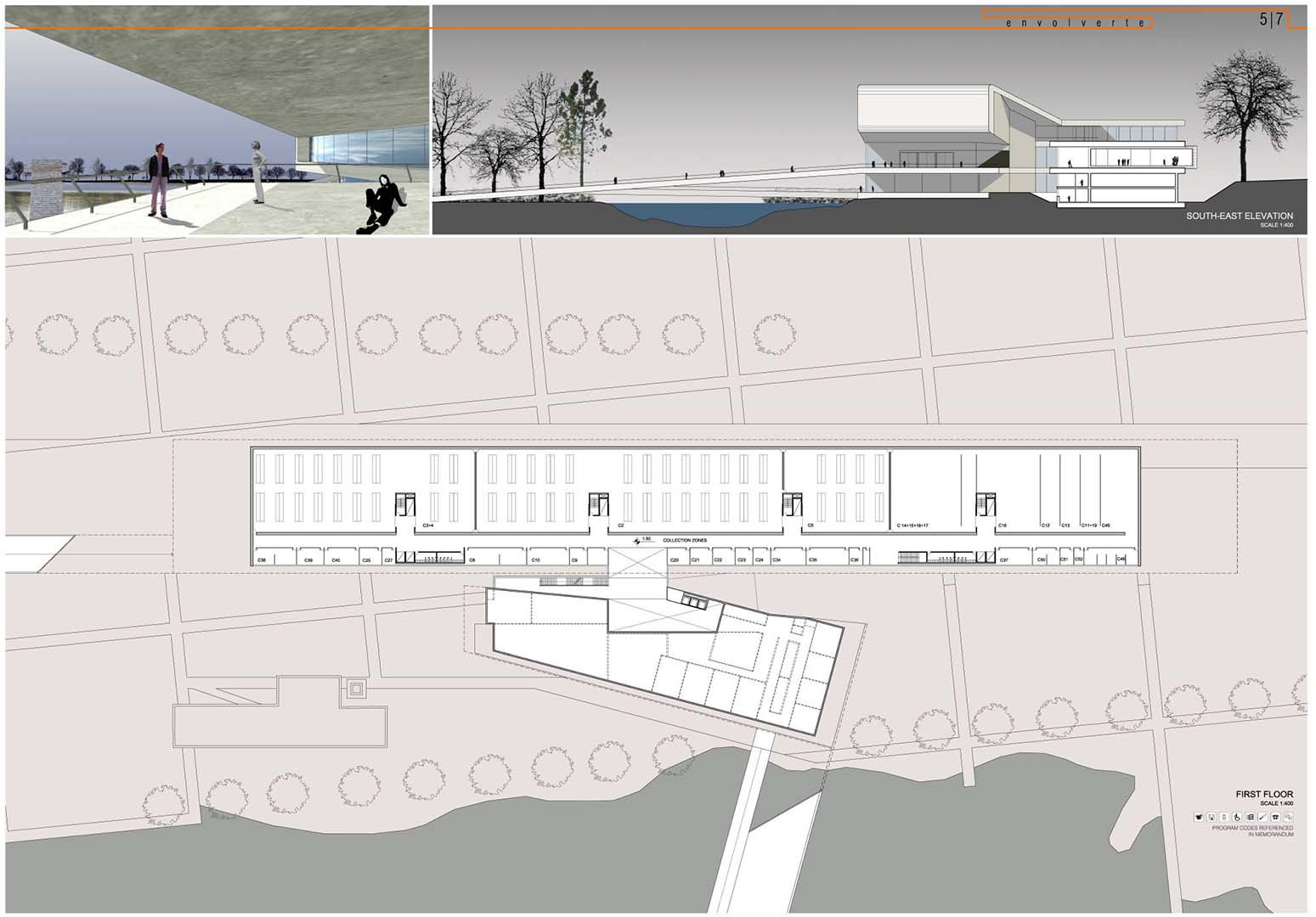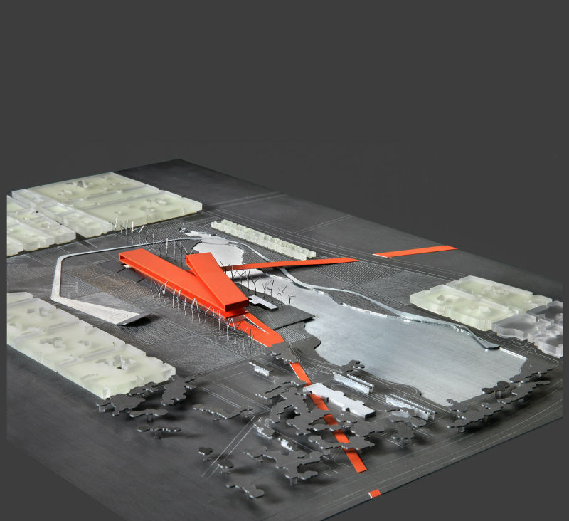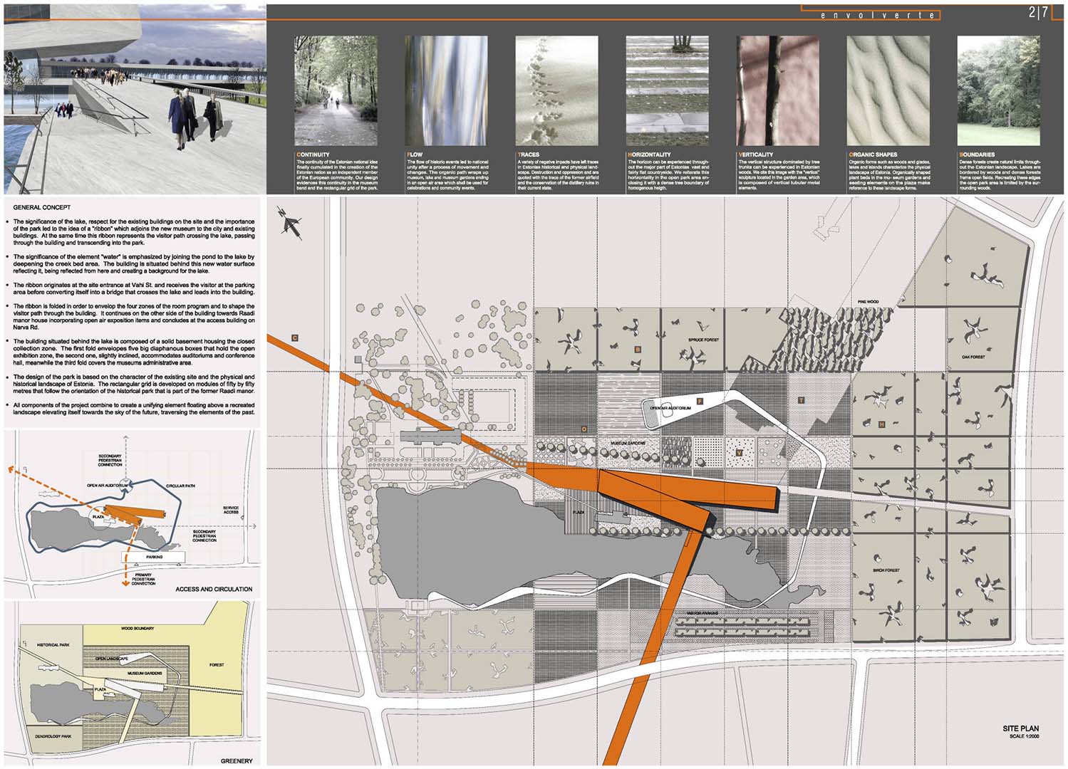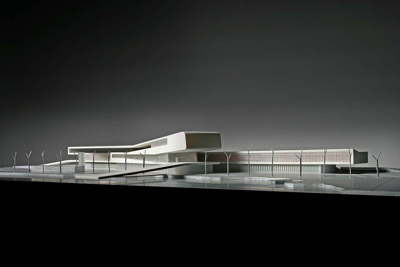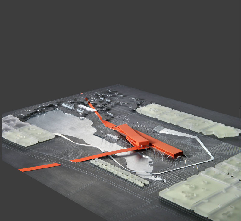 The museum is planned as a unifying element soaring above a recreated landscape; it looks to the future while surveying the elements of the past. It is configured as a "ribbon" that can be used to link the elements of the fragmented environment, and takes shape as a circuit running through them, incorporating them into the architecture. The visit to the museum begins at a distance: from the car park, to a bridge that crosses the waters of the lake, where the shape of the building is reflected as a foretaste of what is to come, and continues into the main hallway, from where it sweeps round to join the programme of the building and takes the visitor through it following the display circuit; then, emerging as if it were into an open air exhibition, carries on through the gardens and the buildings therein, to end up at the entrance pavilion, which could just as well be the start of the route the other way round.