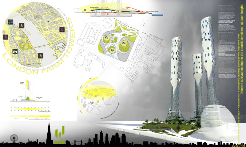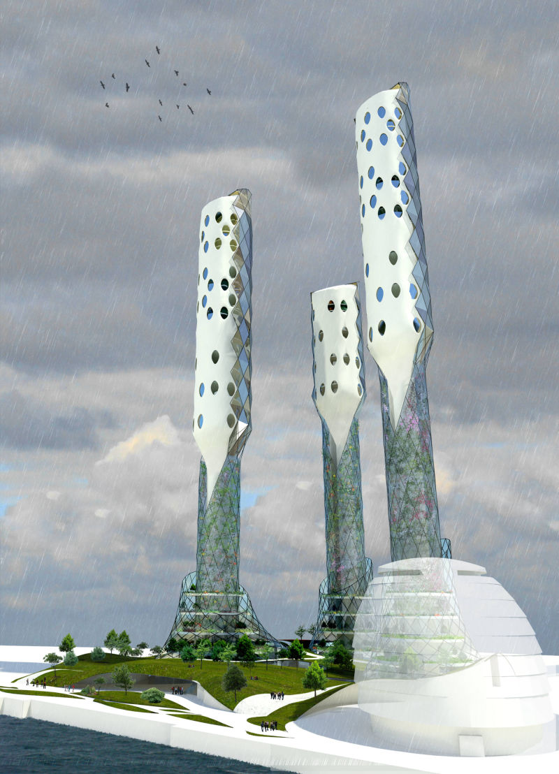 The lower part of each tower: greenhouses with several terraced floors, oriented to the south. Join to laboratories in the shadow areas to the north and to animal farm spaces. Easy entrance and exit of goods and services to develop and distribute the production.