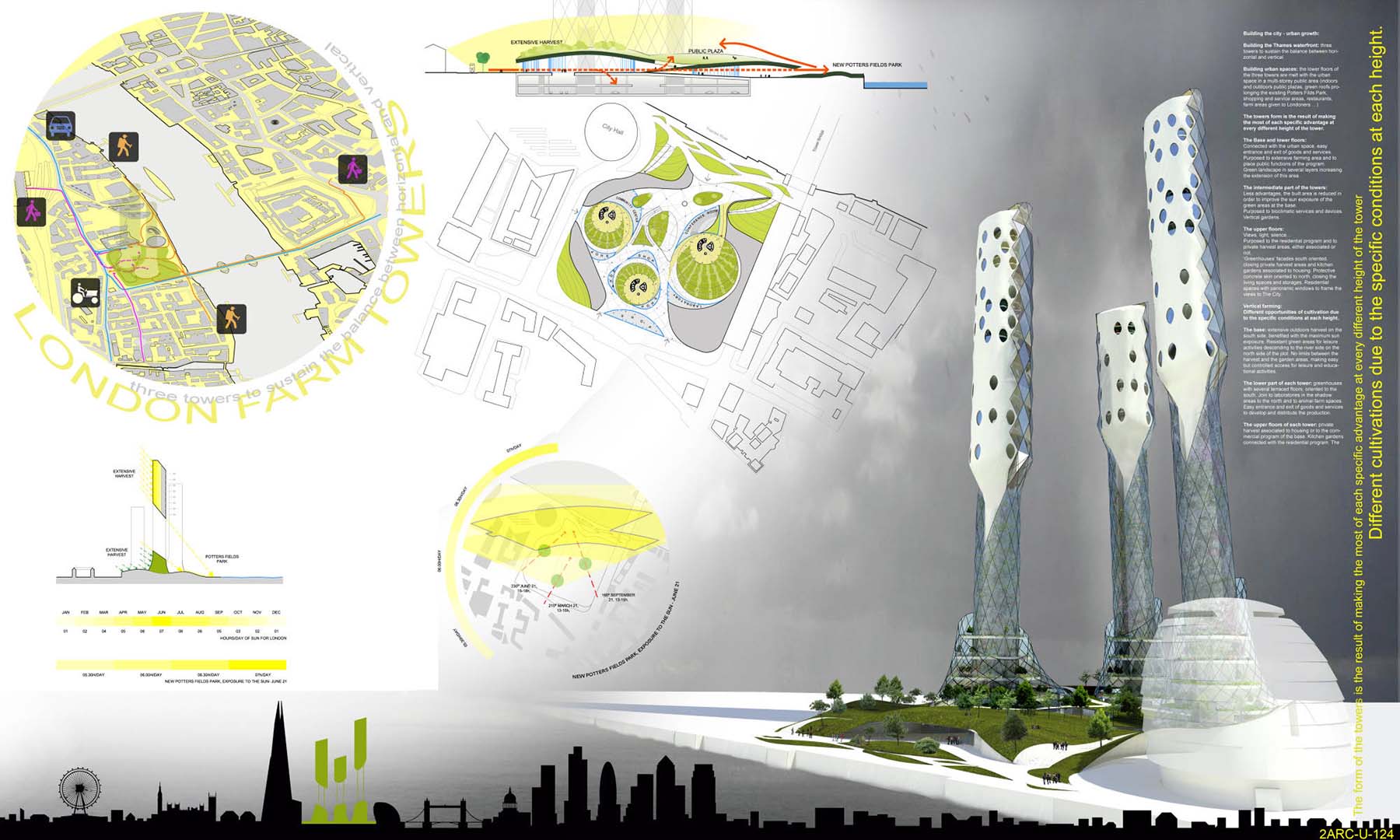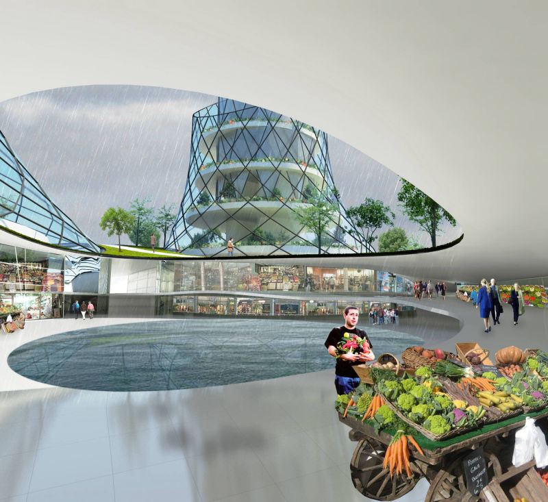Building urban spaces: the lower floors of the three towers are melt with the urban space in a multi-storey public area (indoors and outdoors public plazas, green roofs prolonging the existing Potters Fields Park, shopping and service areas, restaurants, farm areas given to Londoners …) .