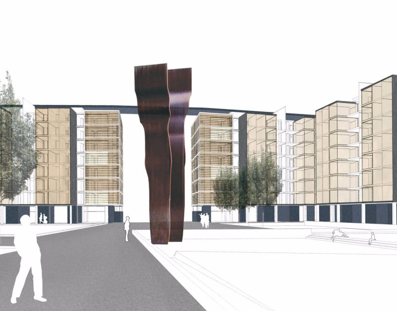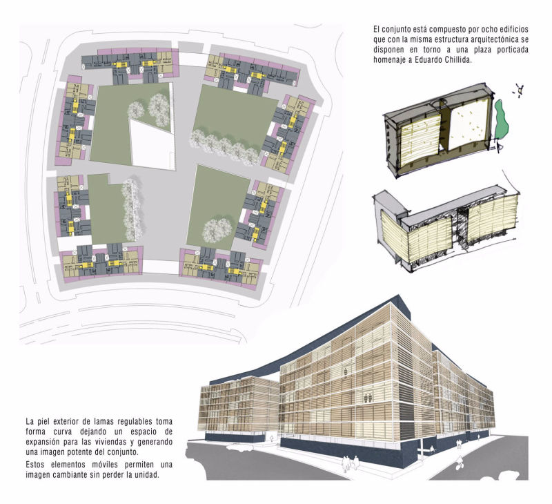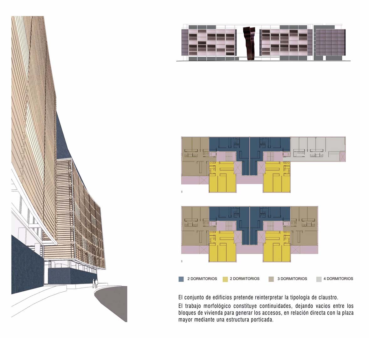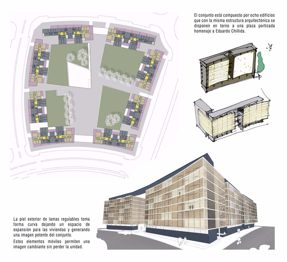 An outside skin of adjustable slats takes on a curved shape, leaving an intermediate space in between it and each modular housing block. This light aluminium skin lends the exterior a powerful image of great strength that invites the public into the "plaza mayor", conceived as a homage to Eduardo Chillida.