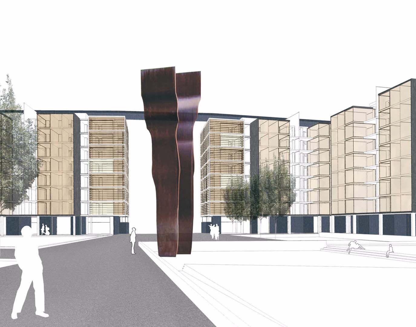The complex is made up of eight buildings with the same architectonic modular structure arranged around a portico covered square. These blocks of flats function independently, permitting smooth access to the square though the open spaces between them.