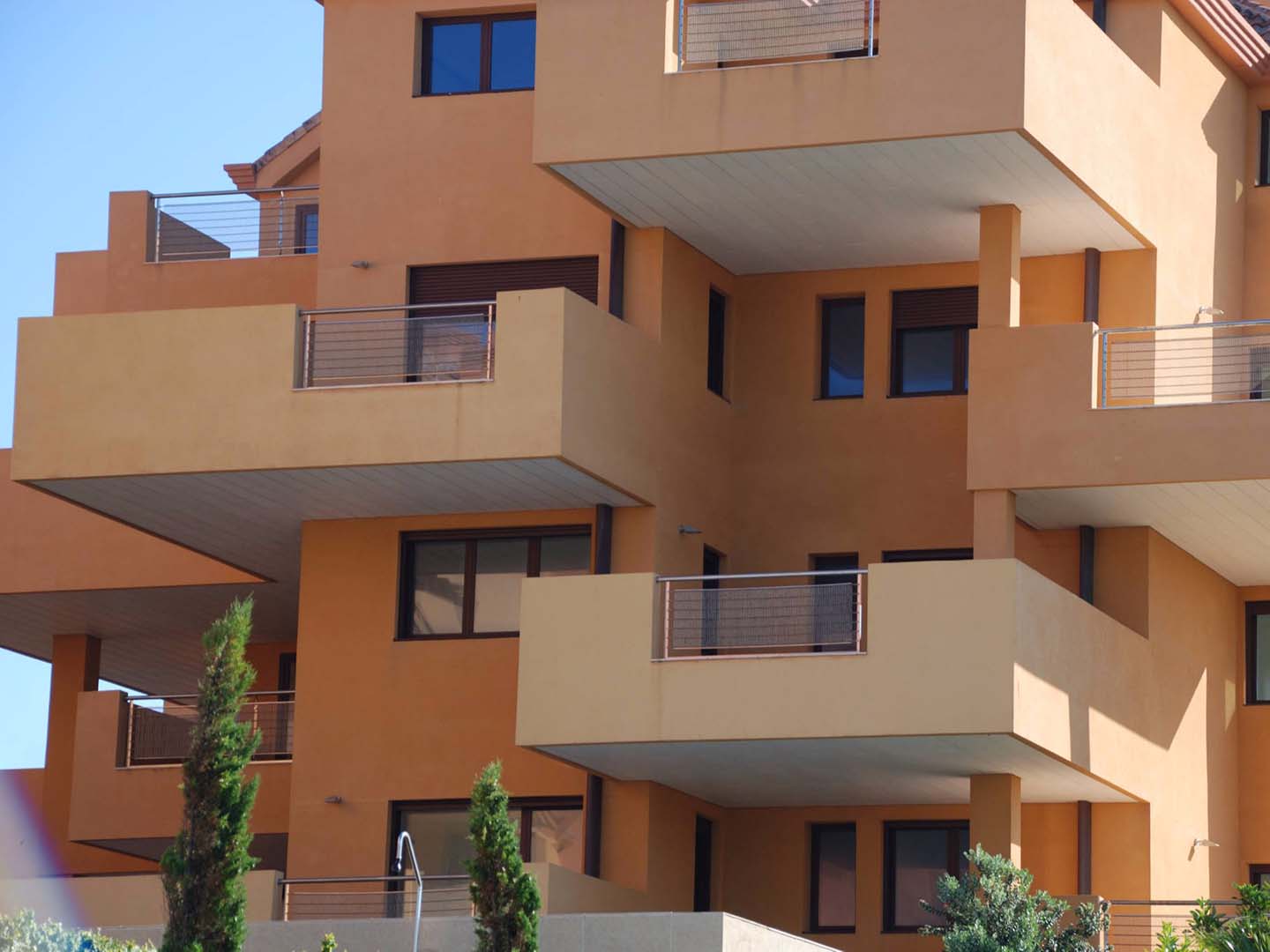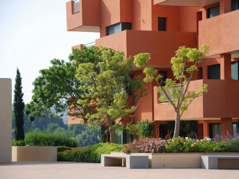The housing blocks surround the open spaces, and are arranged so that they benefit from the best of the sun and the views. The play of light and shade produced by the balconies' projecting edges emphasize the volumes. All the flats have two way orientation to favour natural cross ventilation, which minimizes the need for energy consumption in air conditioning.