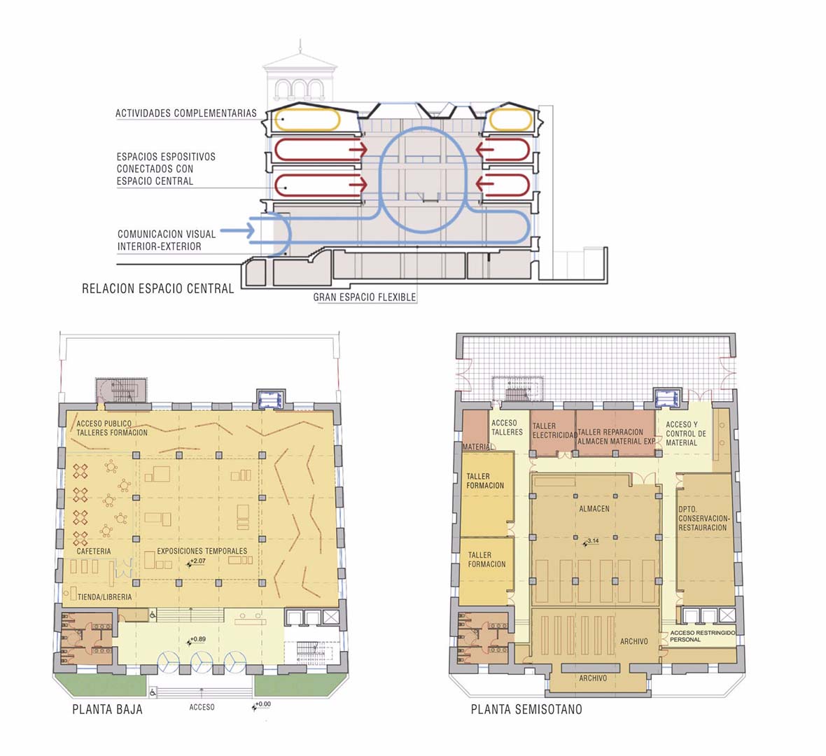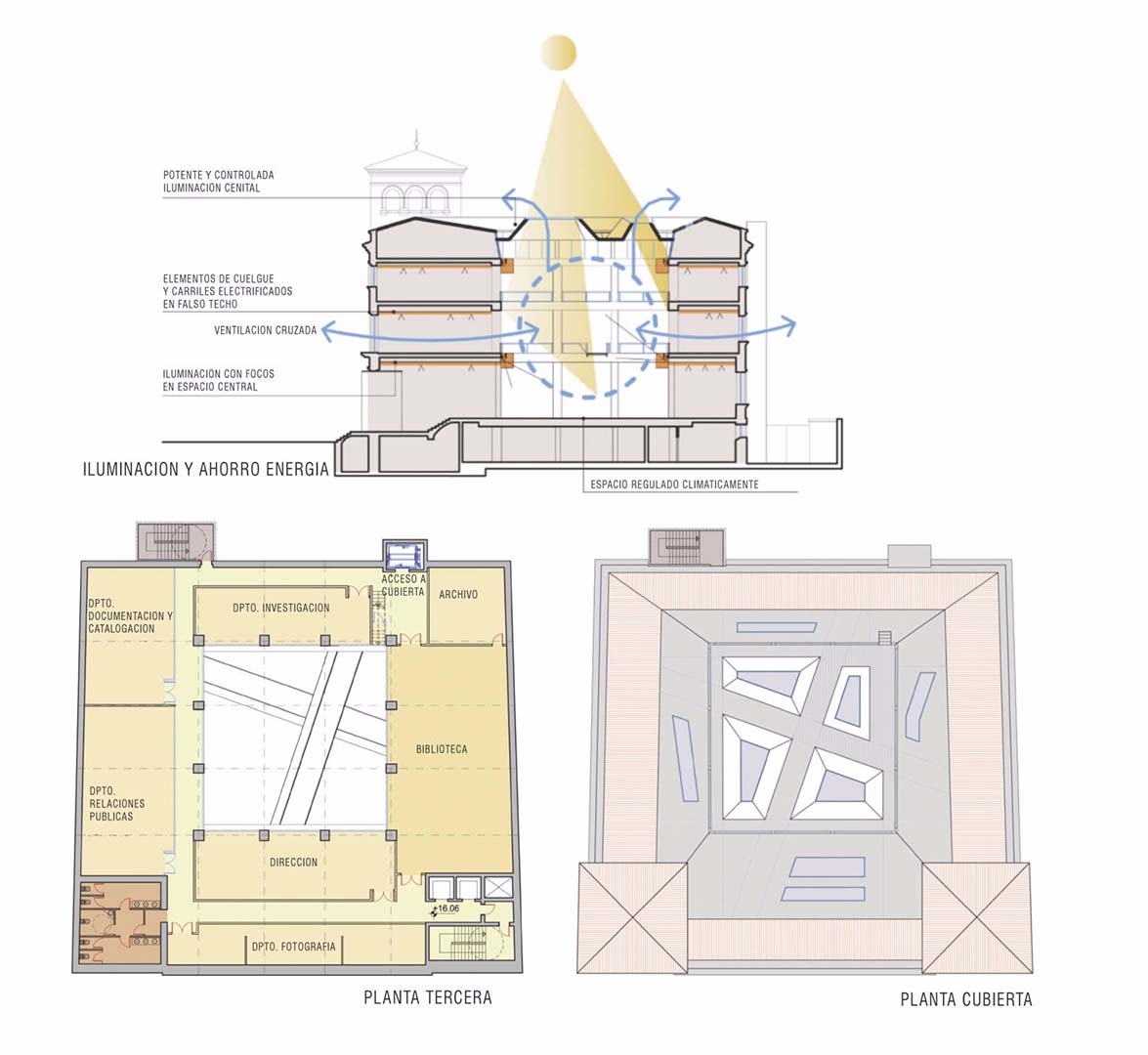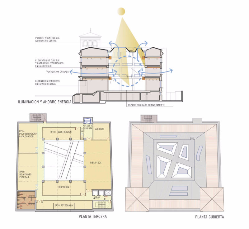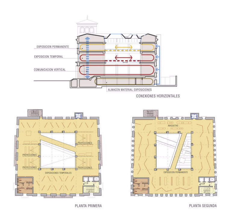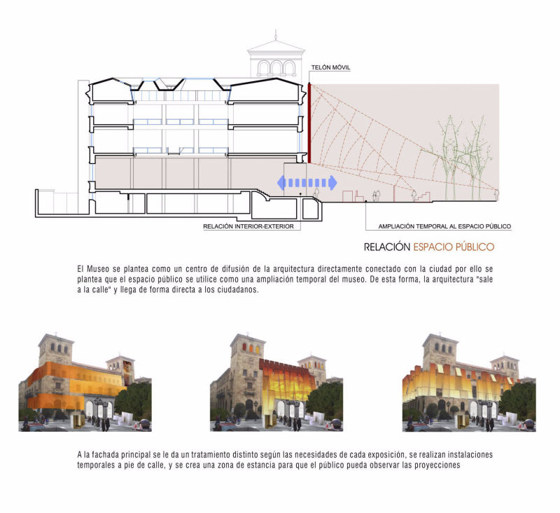 The project for the National Museum of Architecture and Urbanism in Salamanca is proposed as a centre for the diffusion of architecture, directly connected to the city. For this reason it is proposed that public space be used as a temporary extension of the museum. In this way, architecture goes out into the street and reaches the citizens at first hand.