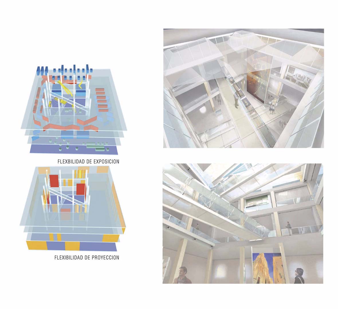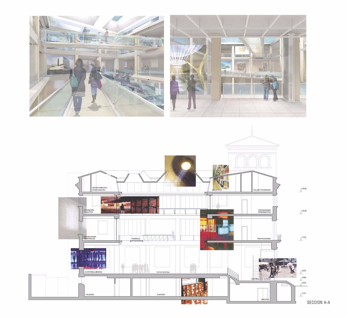 The interior space is planned to include a great central courtyard which immediately becomes the centre of attention. It is a multi purpose space for projecting onto curtains and moveable panels, for displaying scale models, and is crossed by two gangways that horizontally connect the exhibition areas.