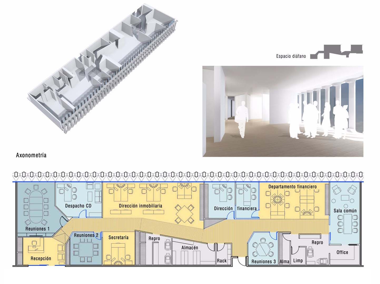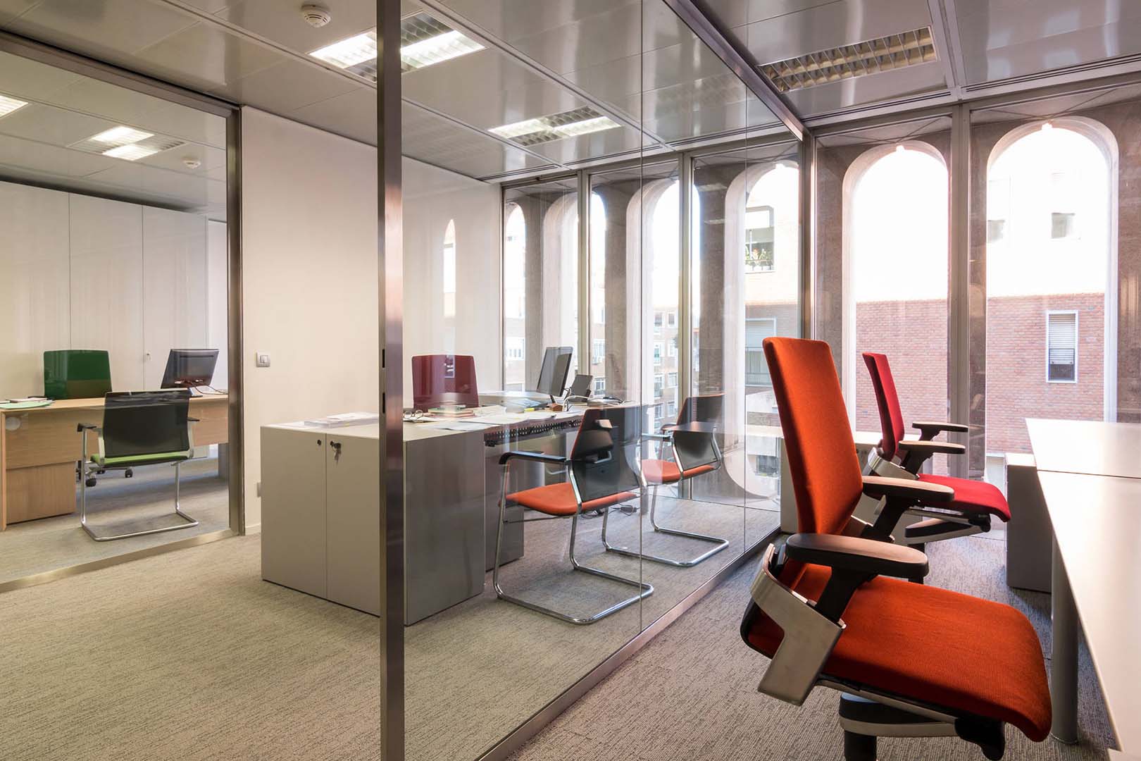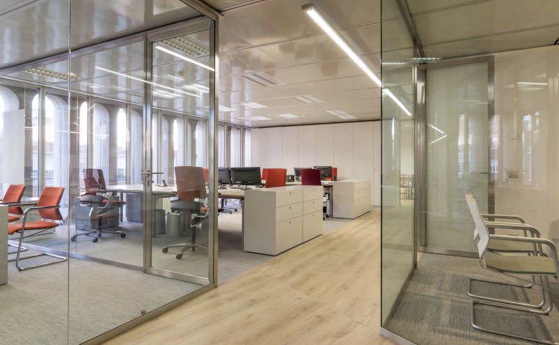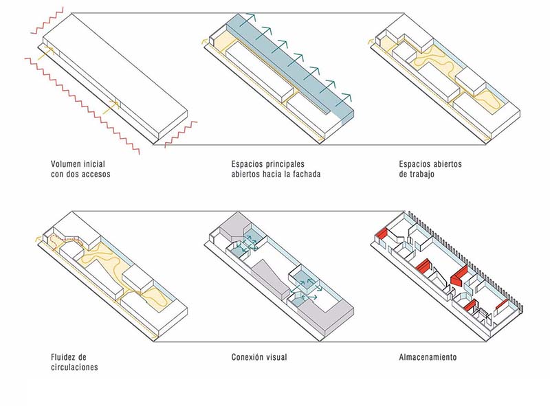 In this project, visual resources are emphasised in order to resolve the complex spatial distribution required. The use of colour provides spatial references and core elements are highlighted. By means of the combination and breakdown of different visual axes, using glass walls with different opacity and transparency ranges, space dimensions are balanced and the monotonous original spaces are customised.