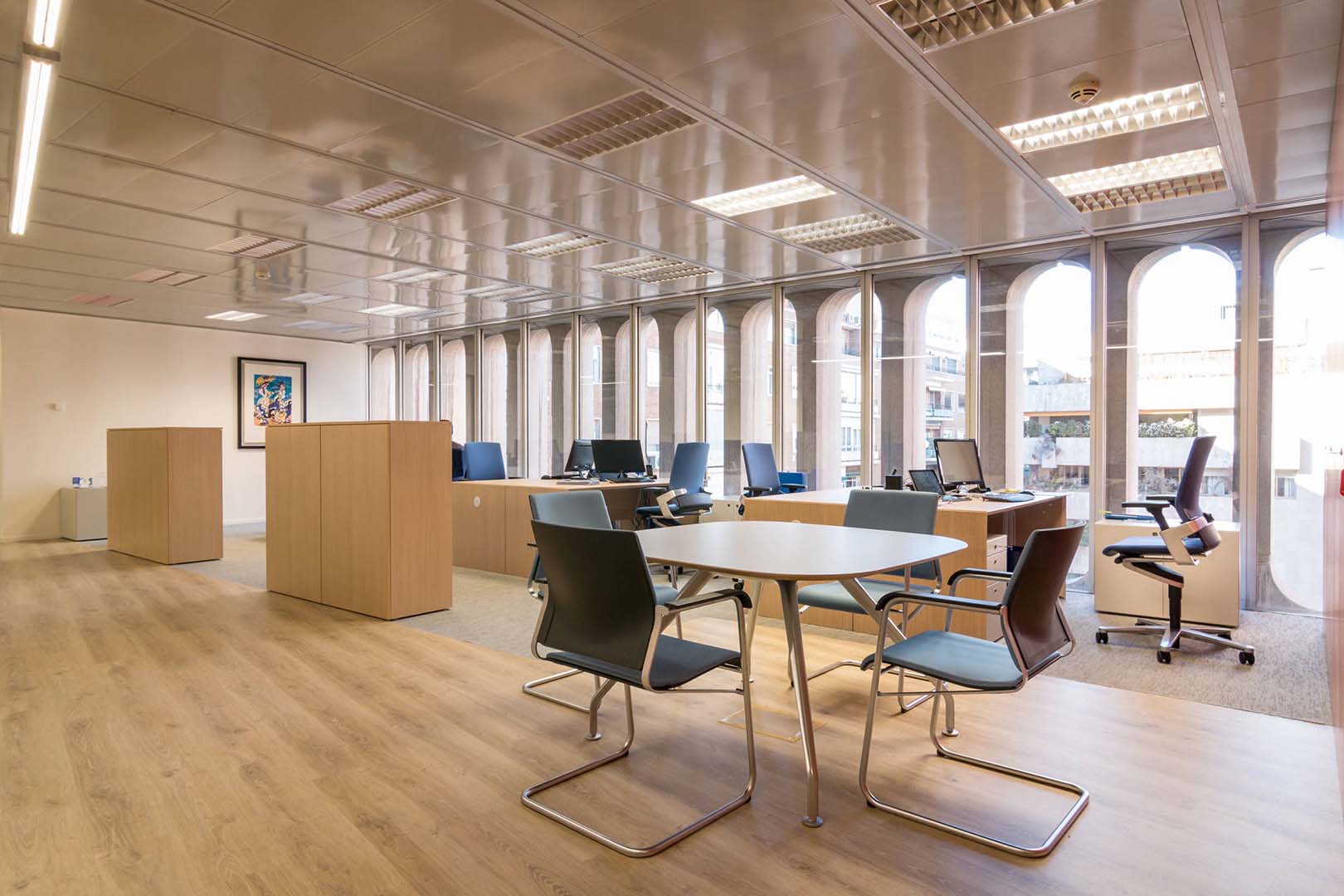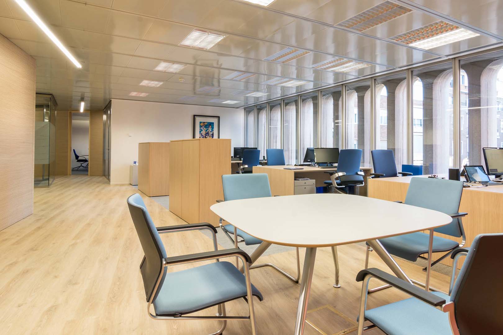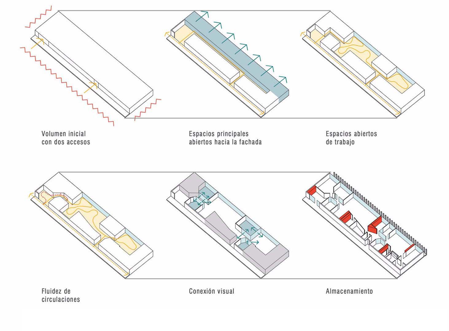 In this project, visual resources are emphasised in order to resolve the complex spatial distribution required. The use of colour provides spatial references and core elements are highlighted. By means of the combination and breakdown of different visual axes, using glass walls with different opacity and transparency ranges, space dimensions are balanced and the monotonous original spaces are customised.