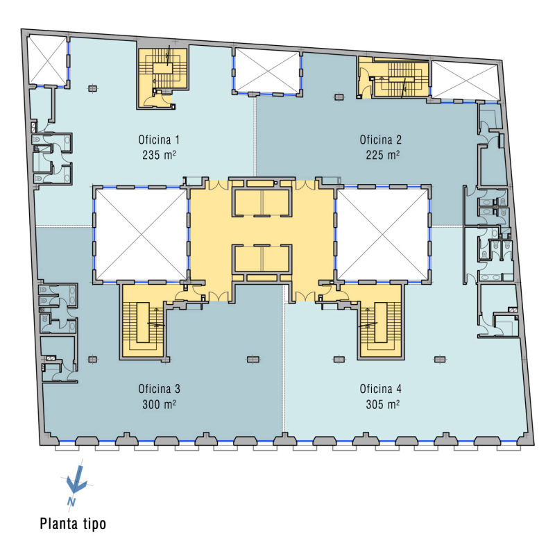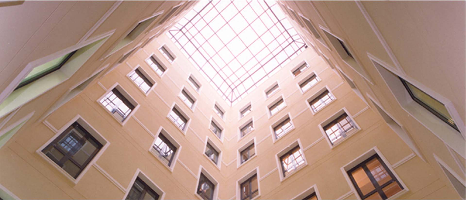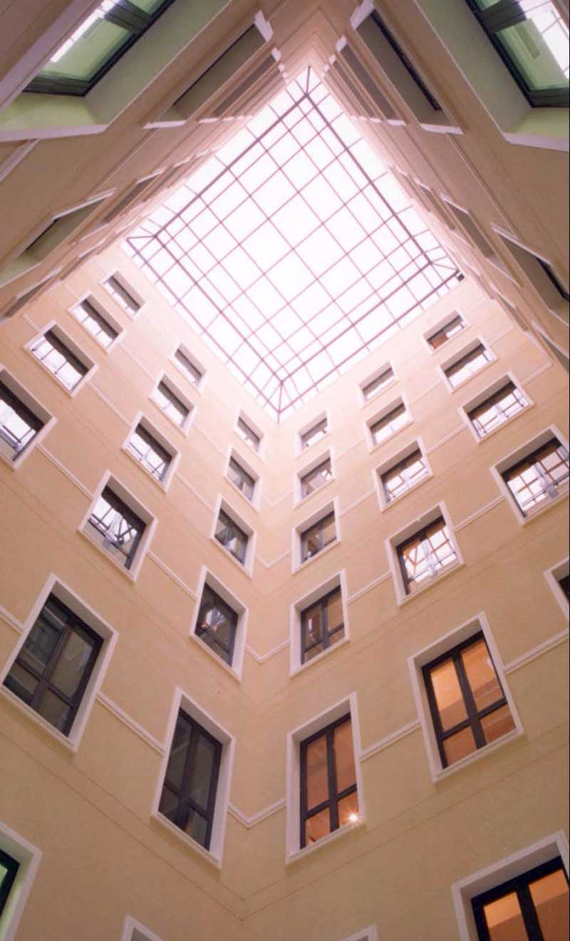 Estos patios, con su nueva entidad arquitectónica, se cierran con lucernarios cuya geometría y construcción proporcionan un elevado nivel de iluminación natural, a pesar de estar el edificio situado entre medianeras. El aprovechamiento máximo de la iluminación interior y disposición del núcleo de comunicaciones permite destinarla hasta un máximo de cuatro usuarios por cada nivel.