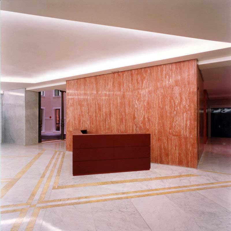 El estado del Edificio implicó la necesidad de ejecutar obras de reconstrucción total, manteniendo fachada y envolvente. Mediante la intervención se proporcionó continuidad visual a los espacios interiores que, a través de compresiones y dilataciones de los elementos de circulación, conectan el exterior, el vestíbulo principal, los tres patios interiores y las galerías acristaladas.