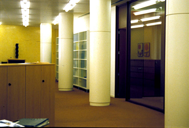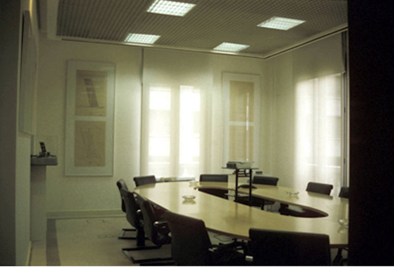 Espacio de oficina en edificio rehabilitado. El diseño planteado persigue una unidad formal y enfatiza los elementos estructurales. La gran altura libre del local y los amplios ventanales condicionan la intervención, orientada al aprovechamiento de la luz natural para dotar de gran calidez ambiental a los puestos de trabajo. Se dispone de amplias superficies de archivo con puertas en toda la altura, particiones acristaladas y cuidada iluminación indirecta no deslumbrante.