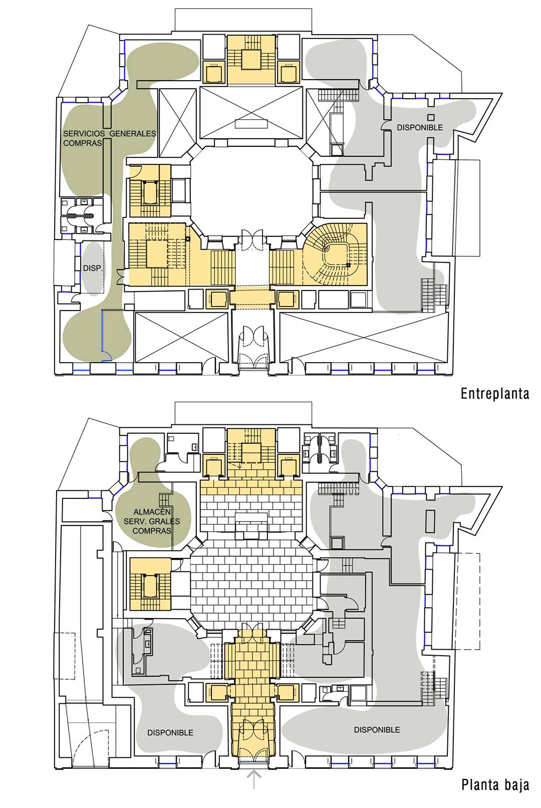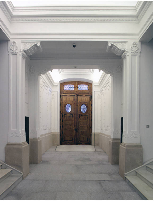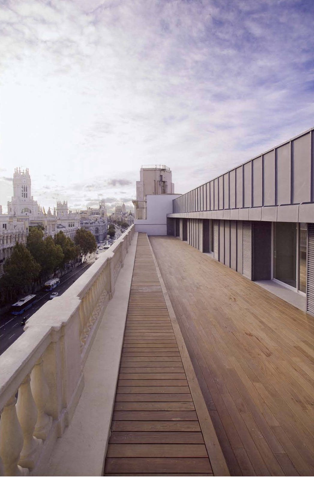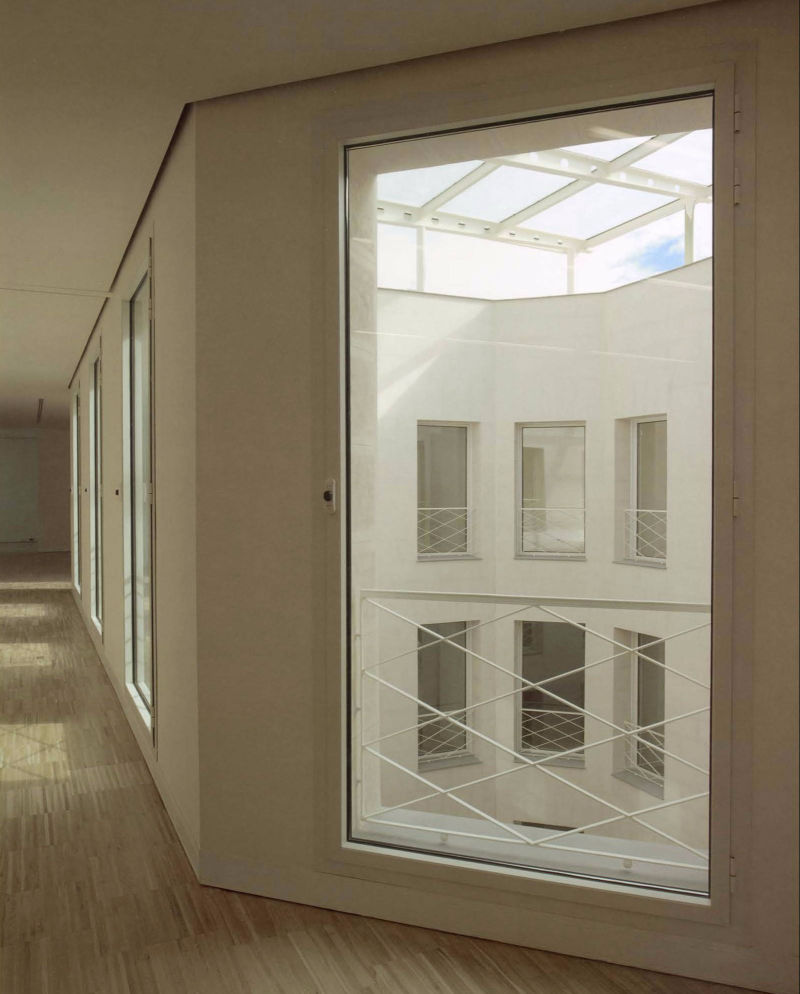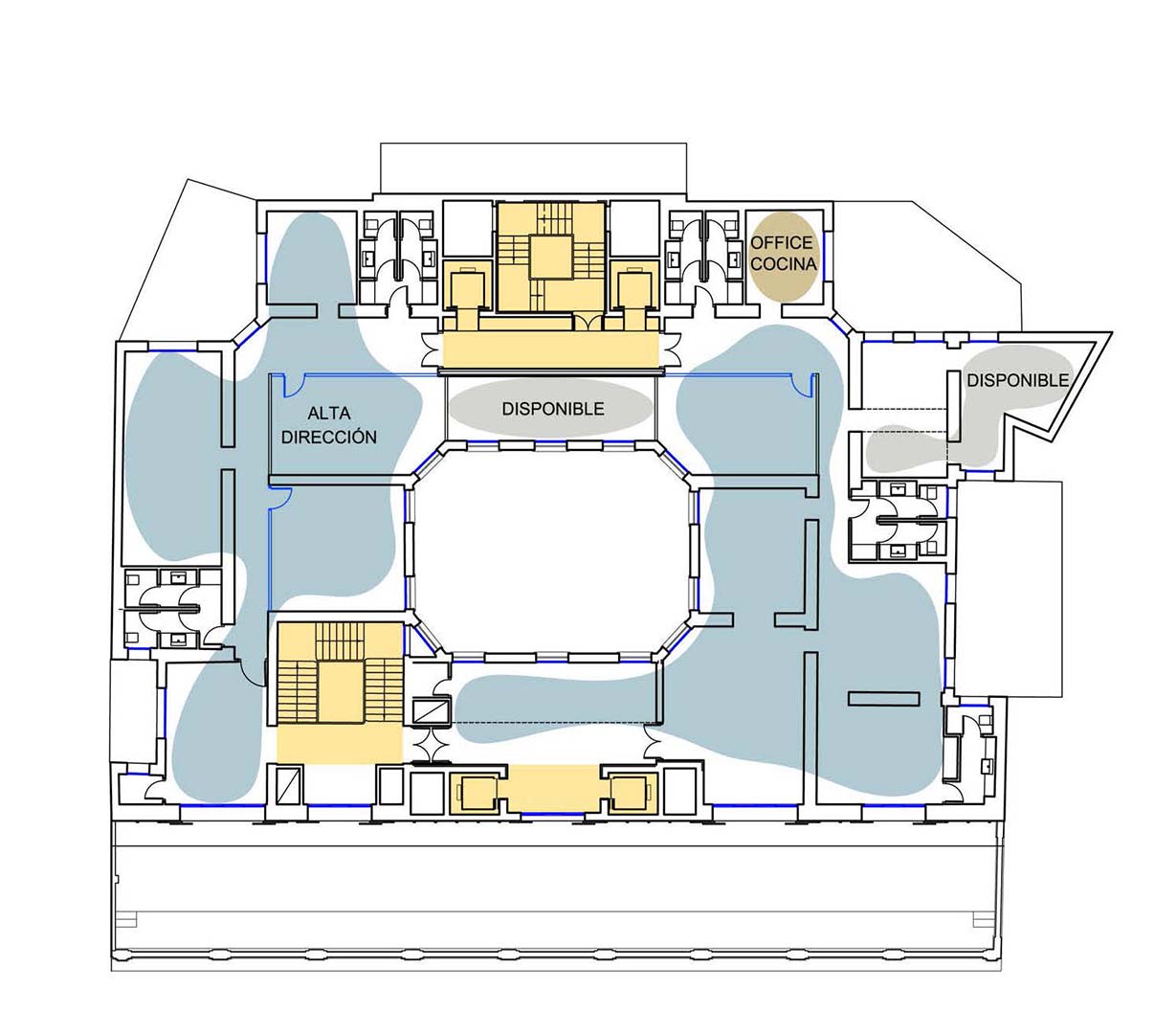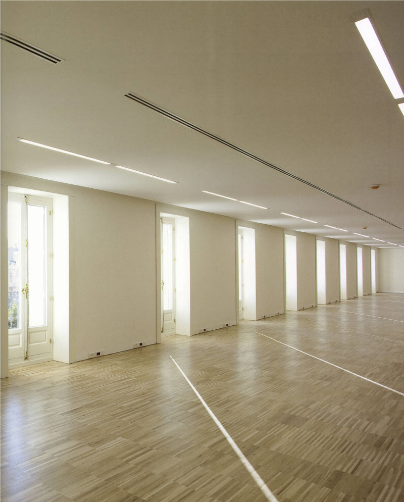 La rehabilitación de este edificio de oficinas implica recuperar los valores arquitectónicos iniciales que habían desaparecido tras sucesivas reformas puntuales. El patio interior, relegado a un uso exclusivamente de servicio y deformado por las distintas carpinterías, modulaciones, tuberías, cableados y maquinarias de aire acondicionado acumulados en el transcurso de los años, se recupera mediante una cubierta acristalada de gran ligereza, con una nueva modulación de huecos concebida como una nueva fachada interior dispuesta para aprovechar la iluminación cenital del lucernario y las nuevas vistas, un ascensor panorámico que, además de mejorar la circulación vertical, sirve para mantener la percepción del patio como un elemento común y no de servicio.