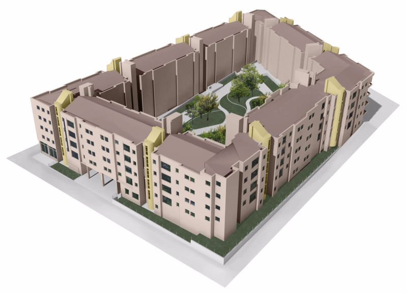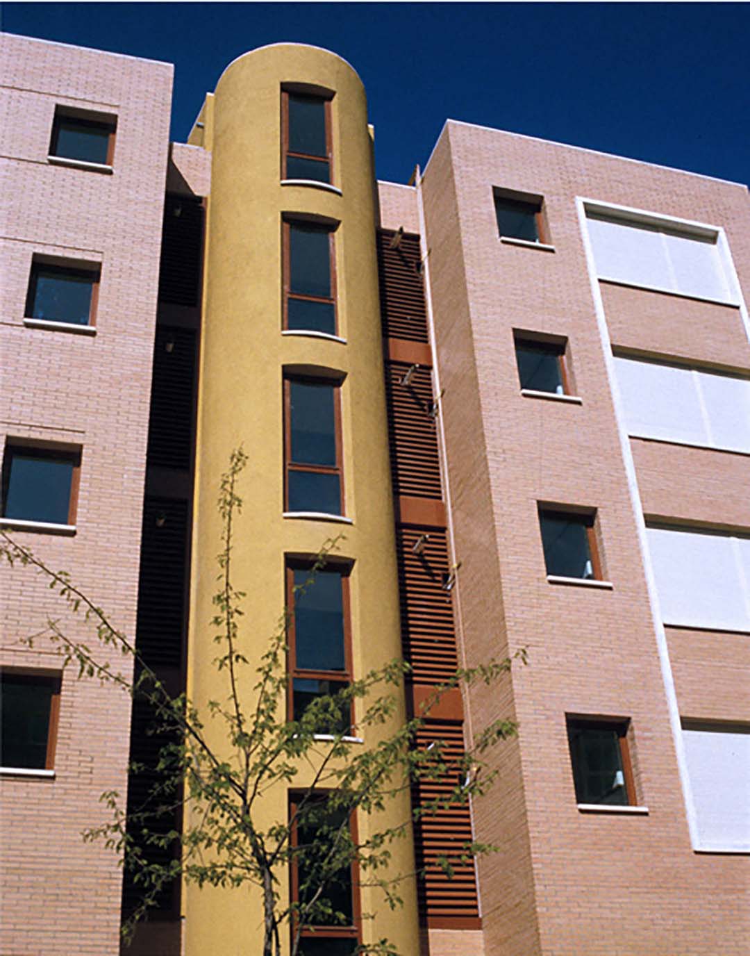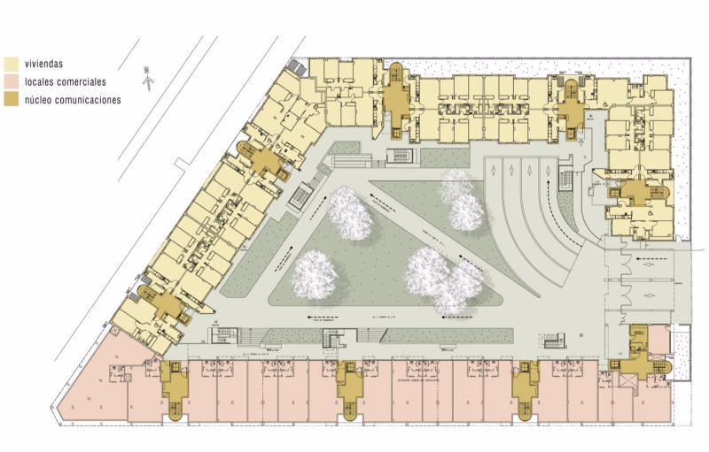 Se agruparon 4 viviendas por núcleo vertical, con escaleras adosadas a fachadas exteriores como elementos singulares, para mejor legibilidad y optimizar la escala del conjunto. Las semitramas estructural, residencial y vehicular responden a un módulo común. Todas las viviendas son exteriores y tienen doble fachada para que puedan disponer de ventilación cruzada.