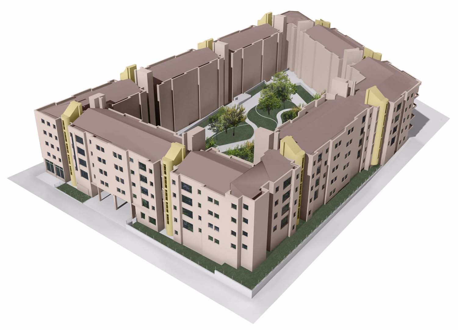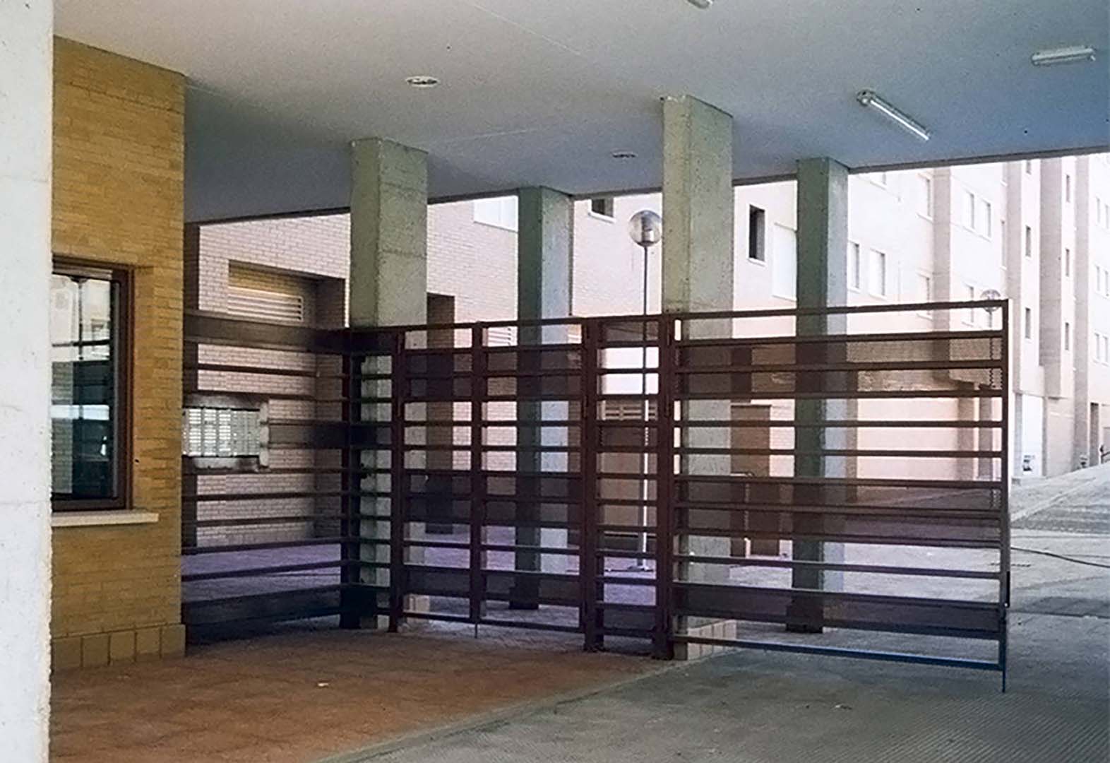 El espacio central se configuró como plaza interior desde la que se accede a los nueve portales del conjunto. Para facilitar el control del acceso a todos los portales, a este espacio solo se podía entrar por un punto, en el que también se encontraba la entrada de vehículos al aparcamiento.