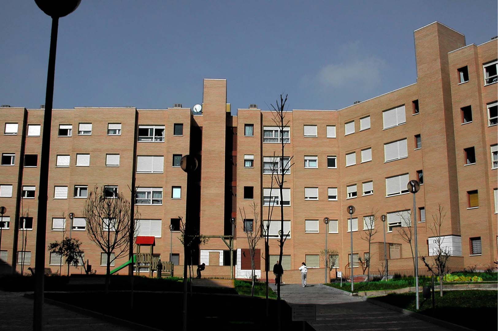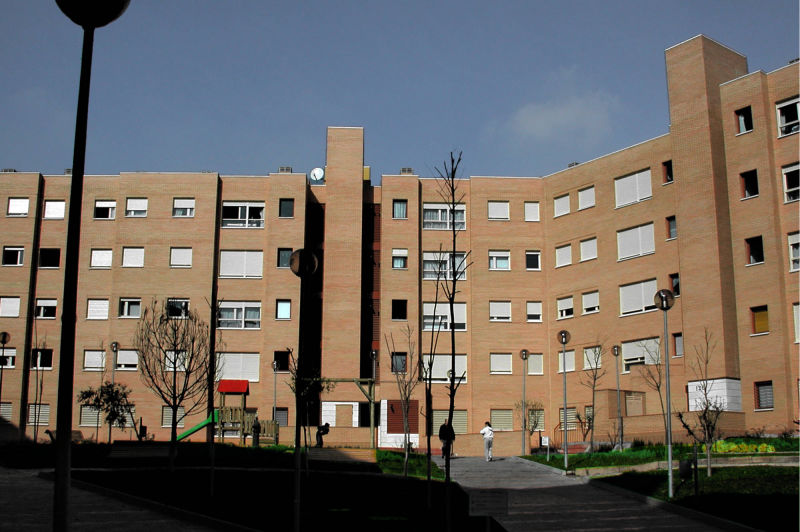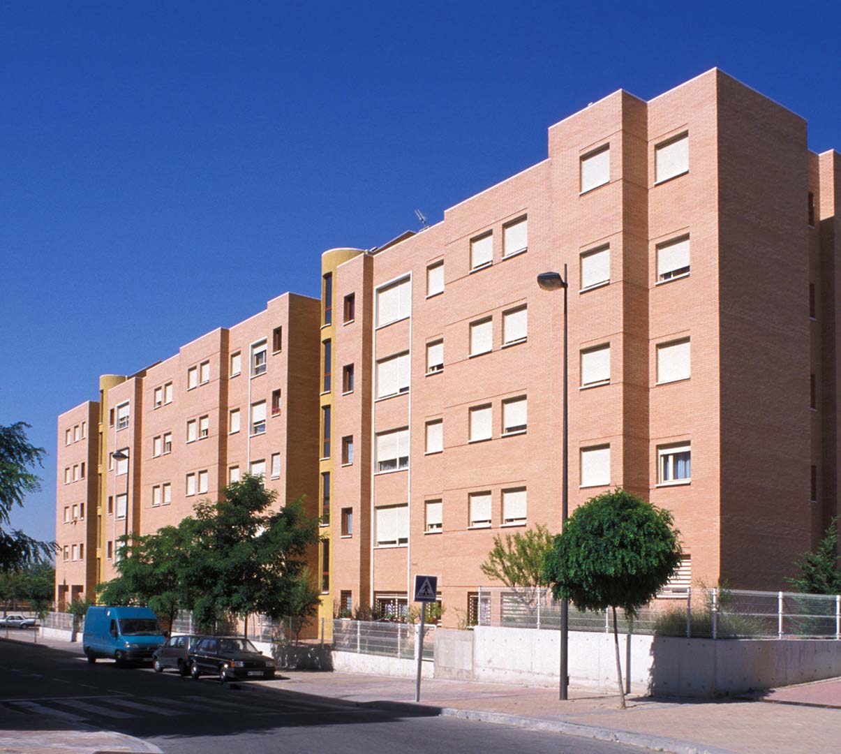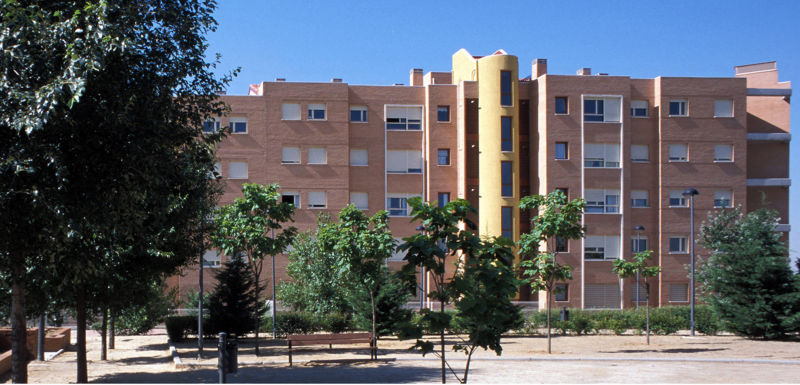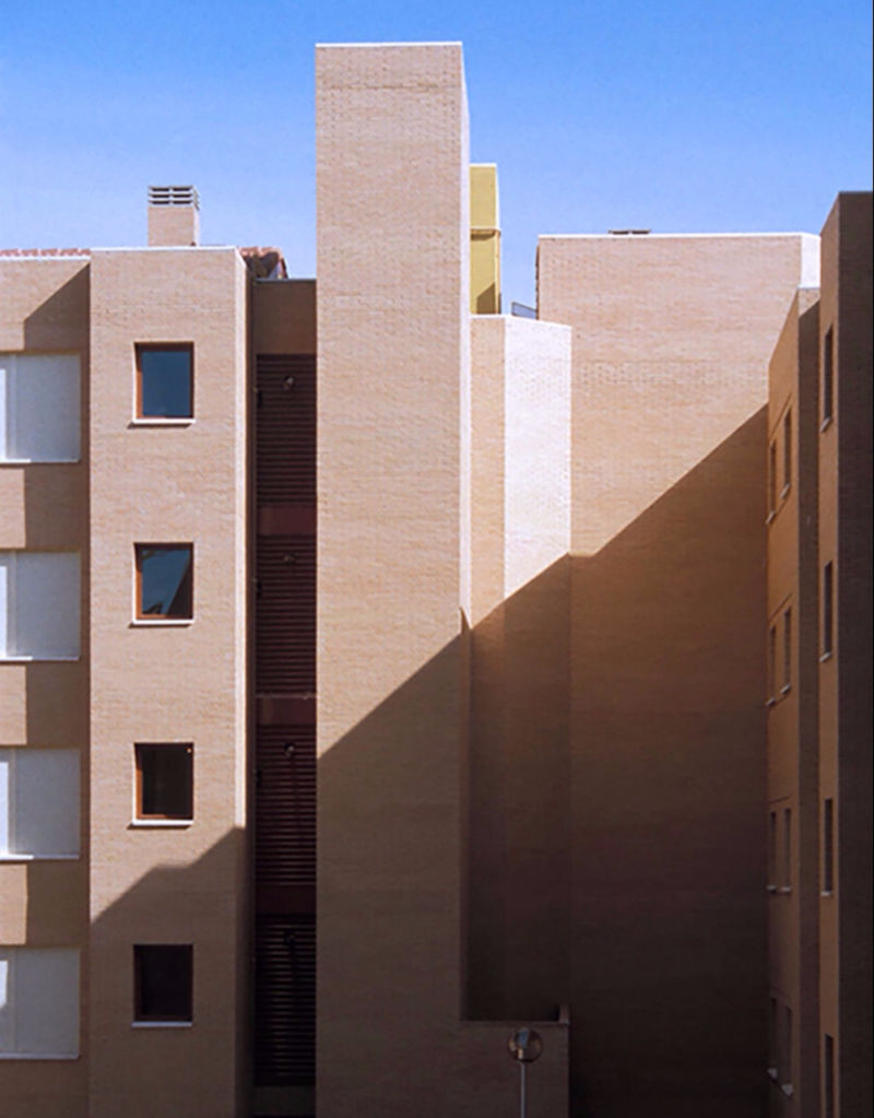 Las fachadas se resuelven con ladrillo visto y recercado de huecos en piedra artificial, diferenciando los núcleos verticales con revoco coloreado. Para compensar la gran longitud de las fachadas, se recurrió a ligeros retranqueos de unas partes de la mismas con respecto a otras, consiguiéndose con ello un ritmo de luces y sombras que dinamizan la imagen de los bloques y es más acorde con una escala doméstica.