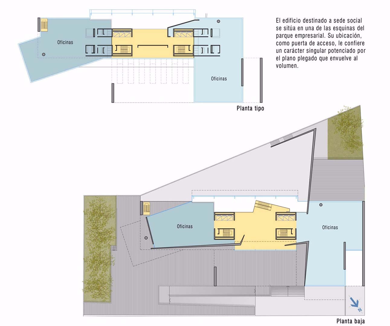 El programa de la sede social empresarial de la Compañía Logística de Hidrocarburos (CLH) se disuelve en el objetivo de proponer una imagen corporativa atractiva y memorable. La unidad del prisma clásico de oficinas se rompe para proporcionar lugares de trabajo y espacios de relación diferenciados y se recompone en un juego volumétrico en el que se potencian los contrastes, las jerarquías y las relaciones entre los espacios cerrados y los abiertos intersticialmente. Al situarlo en el borde de la calle principal de una parcela que se completa con otros edificios de oficinas, se convierte en el frente visible del conjunto, filtrándose la visión del resto de edificaciones a través de sus límites virtuales y de los vacíos que separan los volúmenes.