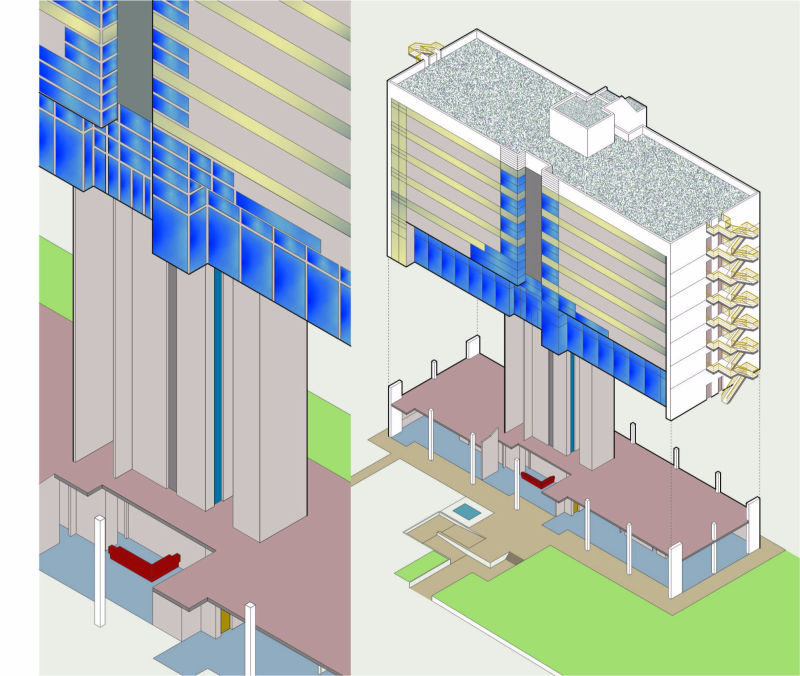 La planta tipo, resuelta en torno al núcleo vertical de comunicaciones tenía las fachadas longitudinales con bandas horizontales acristaladas para lograr una iluminación homogénea y las transversales cerradas con pantallas de hormigón, para garantizar la estabilidad estructural que las acciones sísmicas exigen para Alicante (grado 8).