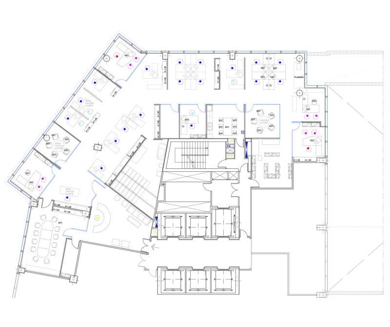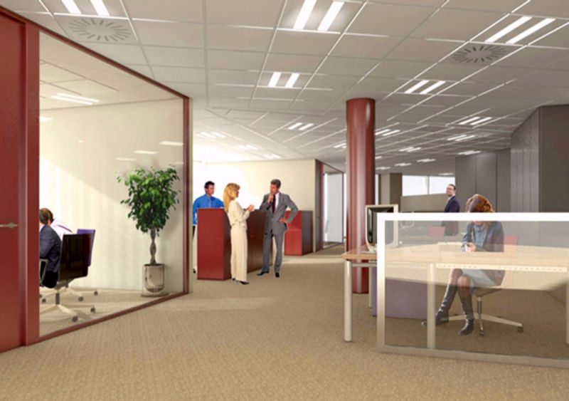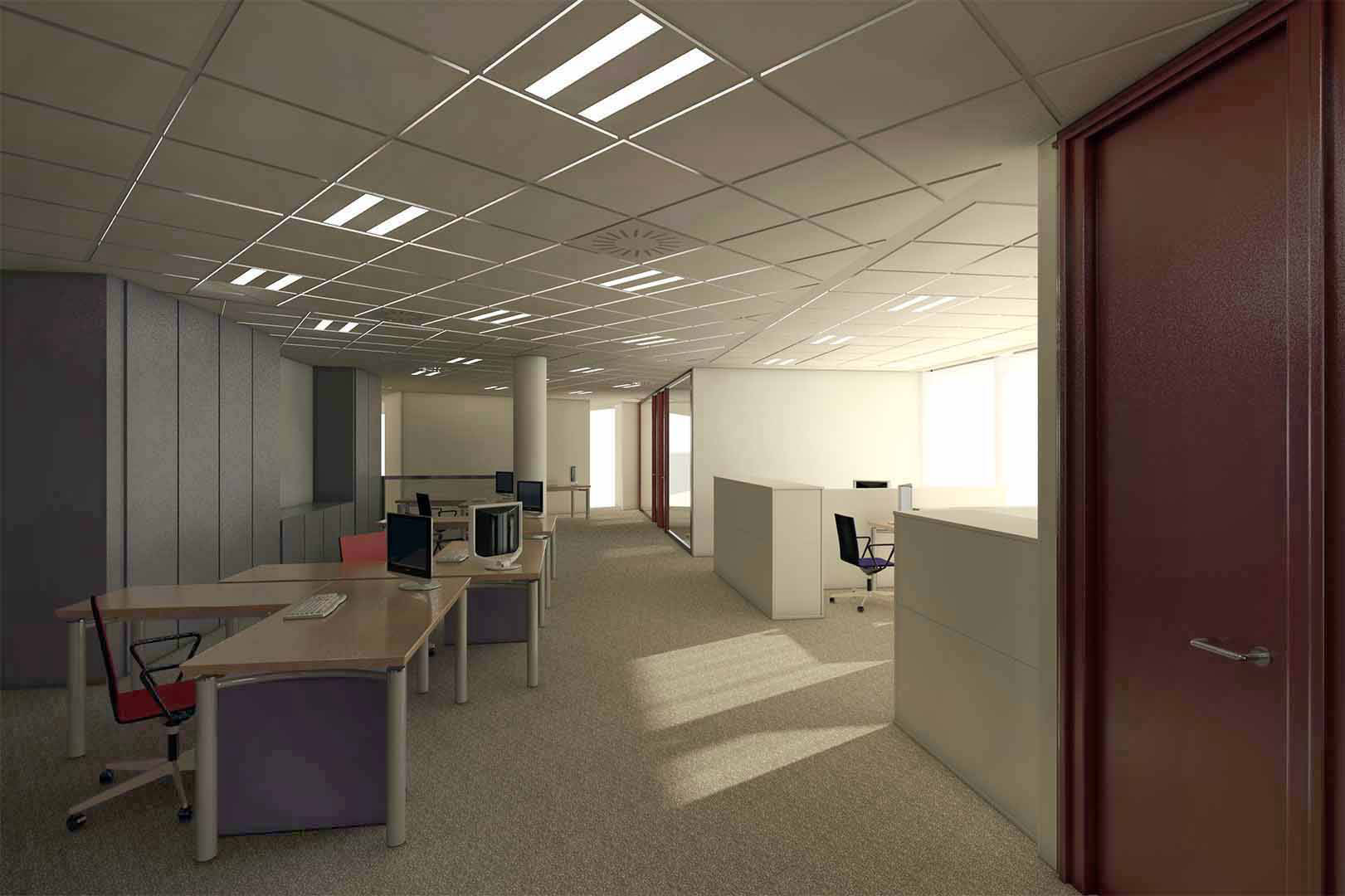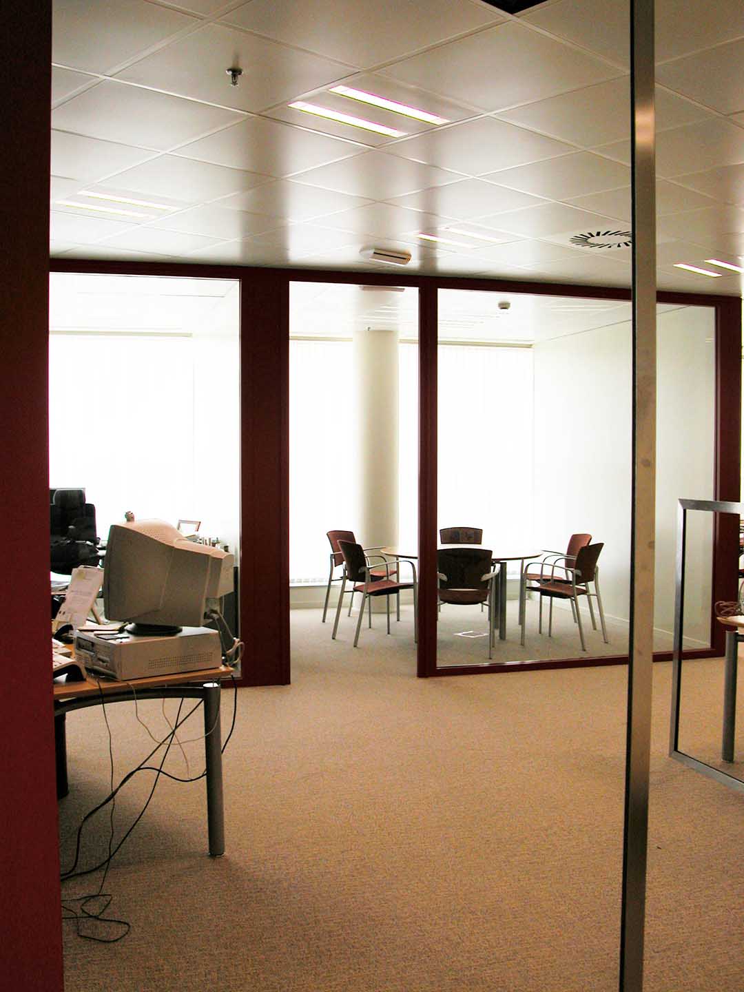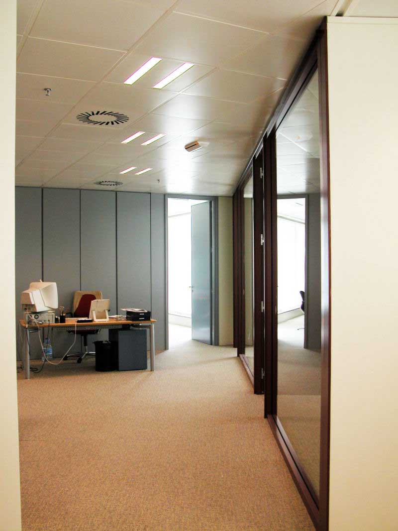 Se optó por concentrar los elementos opacos tales como archivos, instalaciones o aseos junto al núcleo central de ascensores, los elementos individuales acristalados en el perímetro cerrados por esbeltas mamparas de vidrio y las distintas islas de puestos de trabajo en un lugar intermedio; consiguiéndose una fluidez visual continua entre el interior y el paisaje exterior.