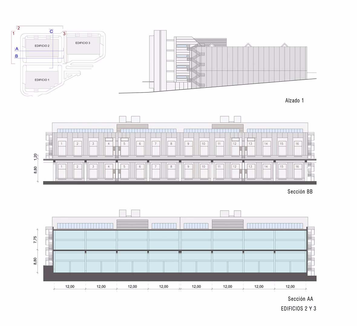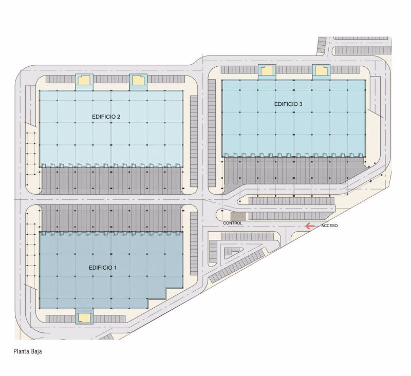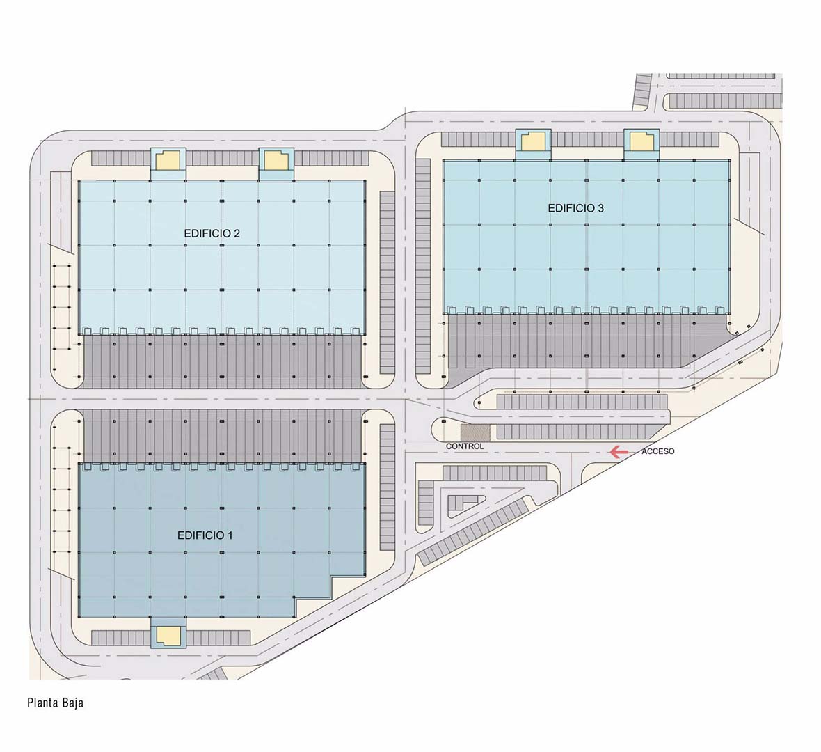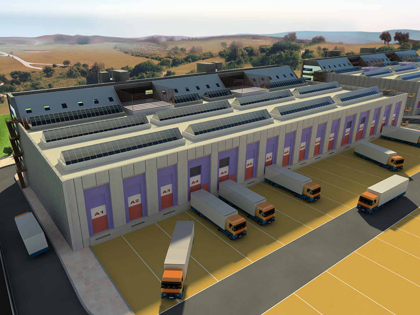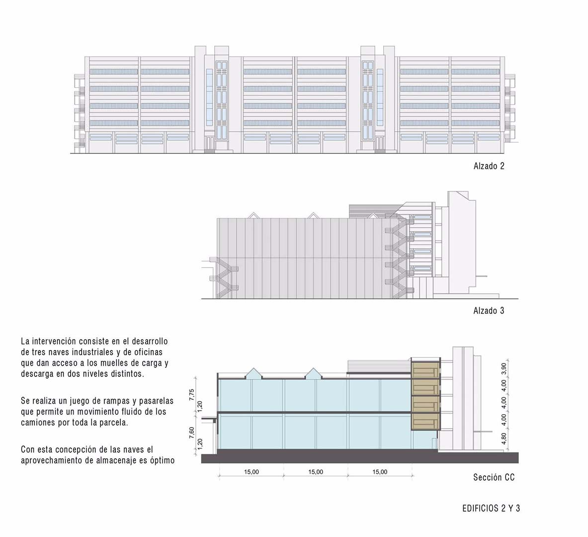 El conjunto incluía edificios destinados a almacenes para logística y redistribución de mercancías, con viales elevados para acceso de los transportes internacionales a los dos niveles de cada volumen y cuerpos de oficinas vinculados a las mismas actividades.