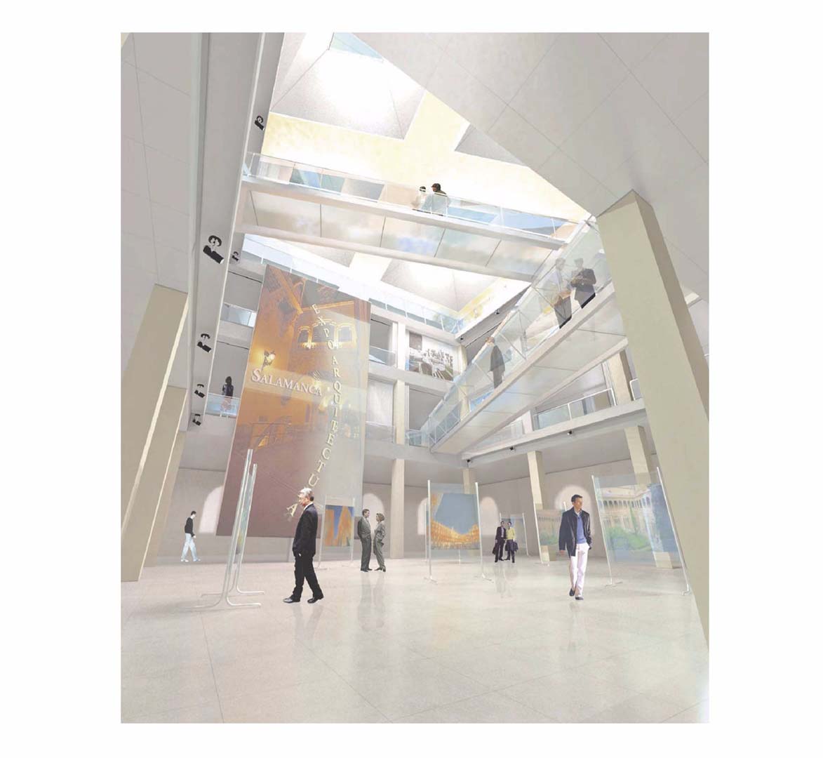 El espacio interior se plantea con un gran patio central que toma todo el protagonismo. Un espacio polivalente para proyecciones en telones y paneles móviles, exposiciones de maquetas, está atravesado por dos pasarelas que conectan horizontalmente los espacios expositivos.