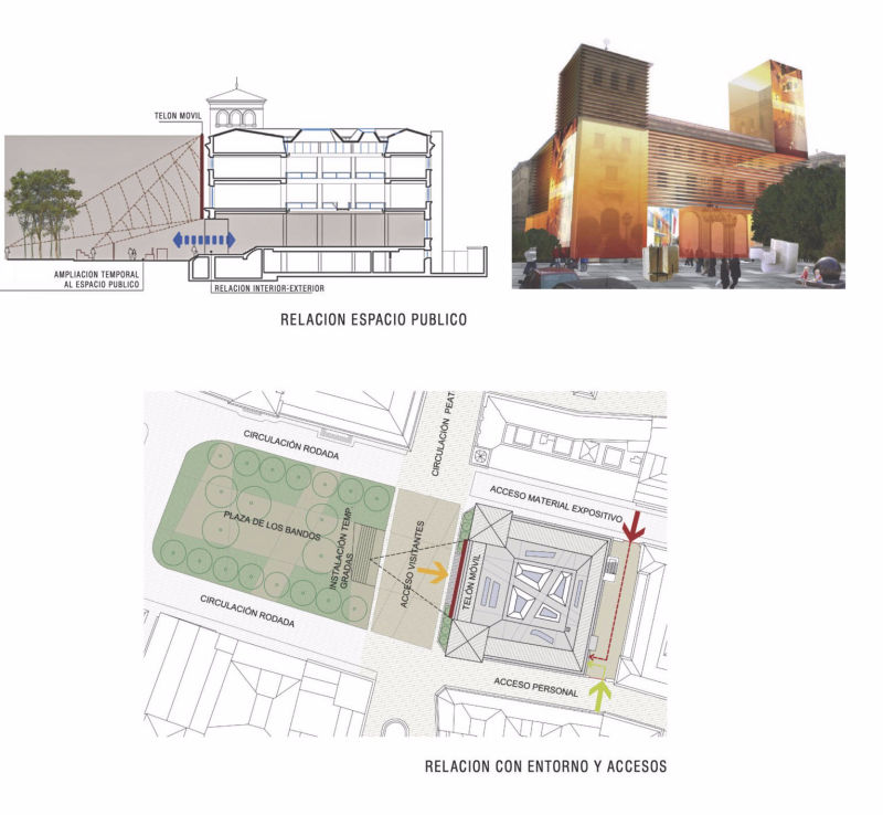 Para ello se le da un tratamiento distinto a la fachada principal dependiendo de las necesidades de cada exposición, se realizan instalaciones temporales a pie de calle, y se crea una zona de estancia para que el público pueda observar las proyecciones.