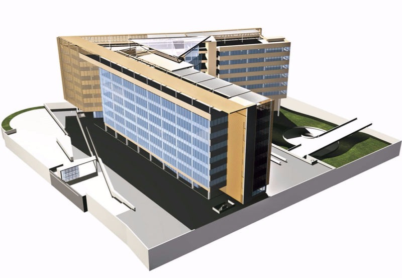 Para este edificio de oficinas se compatibiliza el diseño del edificio y su difícil implantación en el solar, con el objetivo de aprovechar los desniveles del terreno para facilitar la atracción de las visuales desde la Autovía, para que los volúmenes se singularicen y su legibilidad resulte evidente. Se respeta el arbolado de gran porte y edad existente en la parcela, como un valor diferenciador importante no renovable a corto o medio plazo, integrándolo en el edificio como filtro intermedio entre la urbe y el cubículo de trabajo individual provocando un lugar de estancia y relajación para los usuarios.