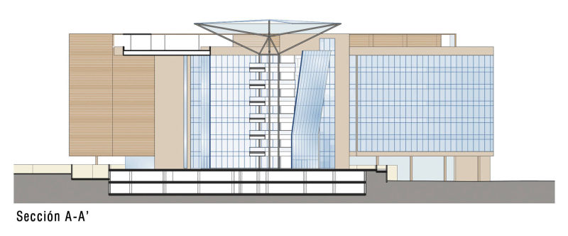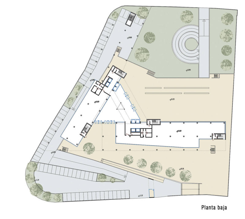 El conjunto se concibe a partir del ángulo NE de la parcela, en el que confluyen los dos volúmenes principales del edificio, fijando los núcleos verticales de comunicación de cada uno centrados en las respectivas fachadas interiores. Un gran atrio de base triangular, delimitado por los volúmenes principales y concebido como un espacio acristalado, se constituye en el vestíbulo principal de acceso y distribución, alojando los dos núcleos verticales de comunicación y las bandejas peatonales que los conectan entre sí, a nivel de cada planta.