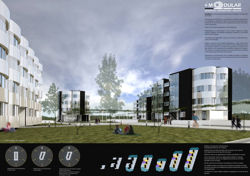 iModular es una propuesta de ideas que se puede adaptar a cualesquiera que sean las necesidades finales. El proyecto se concentra en aportar conceptos que responden a objetivos de excelencia arquitectónica, energética y ambiental. Nuestro propósito es aprovechar positivamente la incertidumbre de no contar con una parcela determinada y proyectar un sistema con ambición paradigmática. Para ello nos concentramos en necesidades y problemas genéricos sólo particularizados para el uso al que se destinará el edificio y el peso que se quiere otorgar a los criterios de calidad y sostenibilidad. La menor especificación de los condicionantes nos permite adoptar una solución que abarca un amplio espectro de posibilidades de ser concretada.