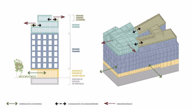 Según la ordenanza urbanística, se permite el traslado de edificabilidad hacia el esquinazo oeste de la parcela, aumentando así el número de alturas en esa zona. Ésto hace posible la creación de amplios espacios exteriores para uso común en la parte superior del edificio, con vistas sobre el entorno urbano.