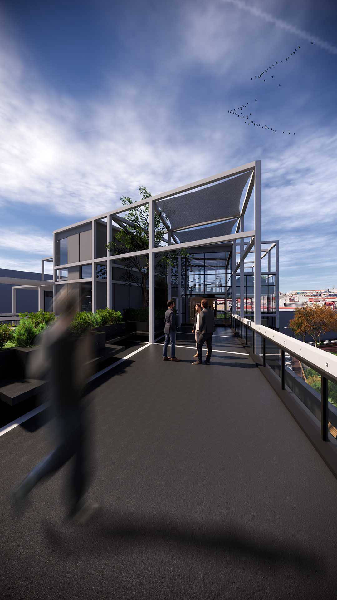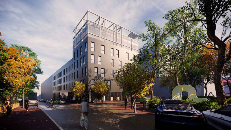El volumen completa la parcela en los niveles inferiores, destinados a los espacios de co-working. En las plantas intermedias el volumen actúa como un basamento para la sección superior, en la que se sitúan las zonas comunes del uso residencial, que queda de este modo diferenciada visualmente de los niveles inferiores.