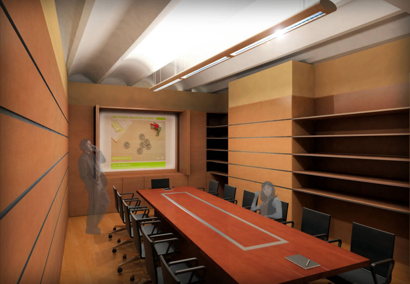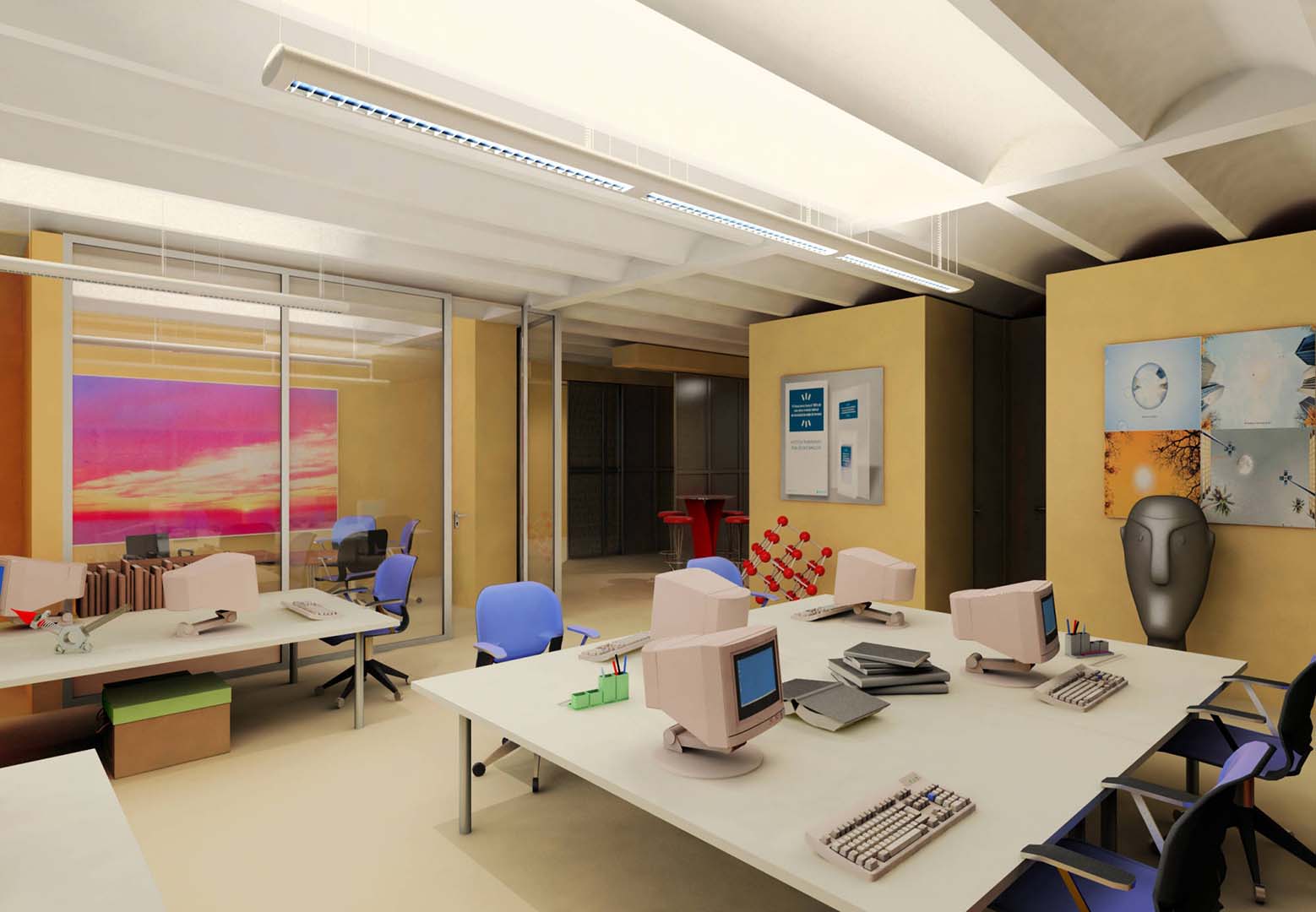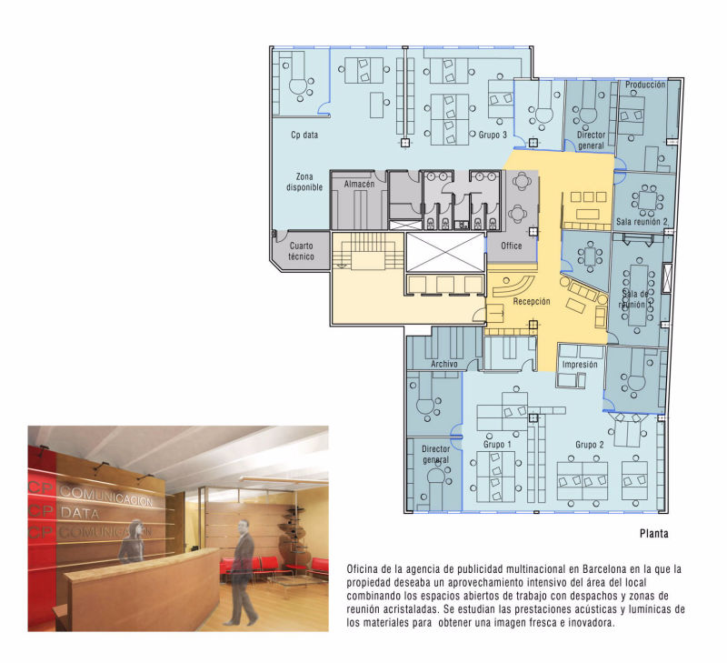 Barcelona office of the multinational publicity agency, where the owners wanted to make intensive use of the floor space by combining open work areas with offices and glass partitioned meeting areas. In order to combine these varying needs, a study is made of the materials as regards their response to acoustics and lighting in order to achieve a uniform layout with the bright, modern image that the agency wanted to transmit to its clients.